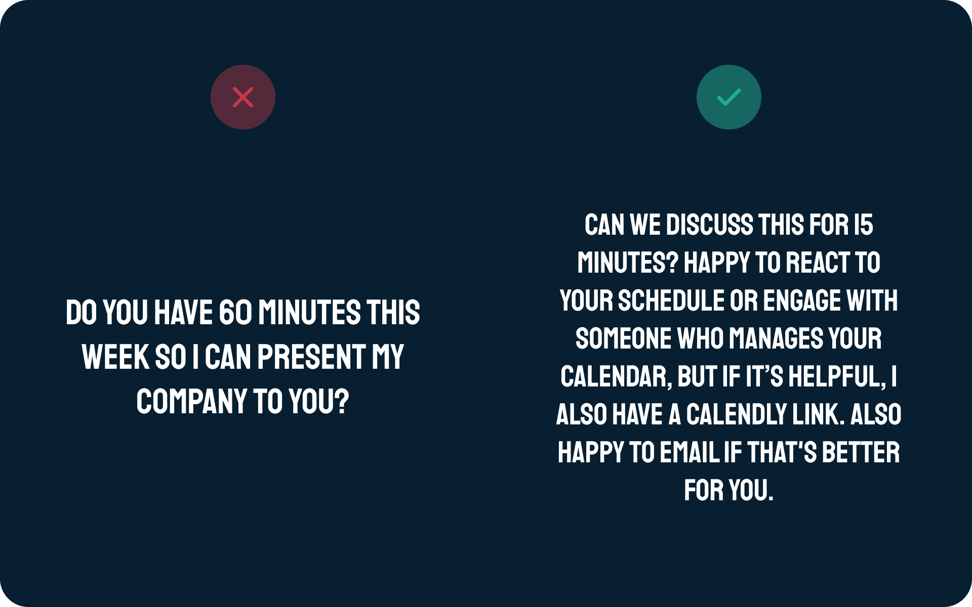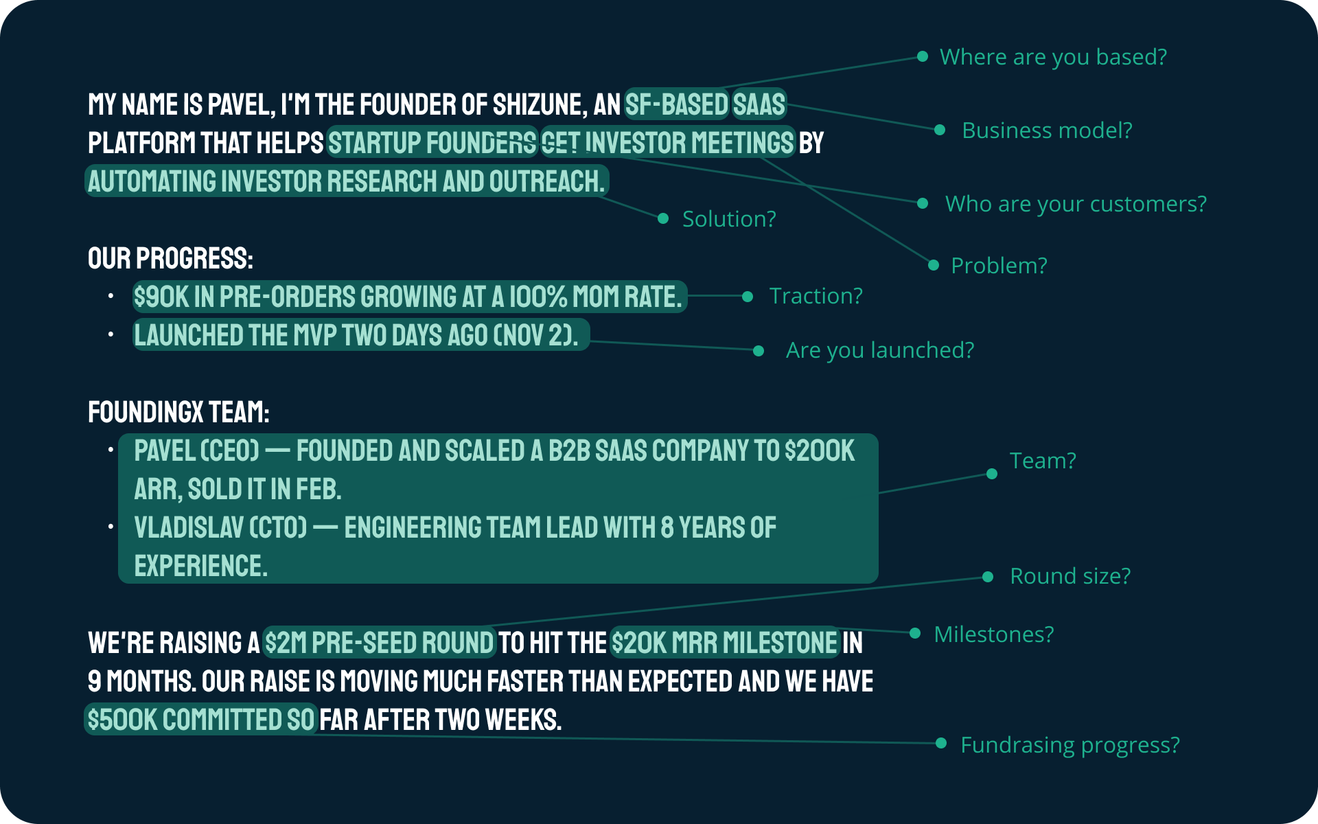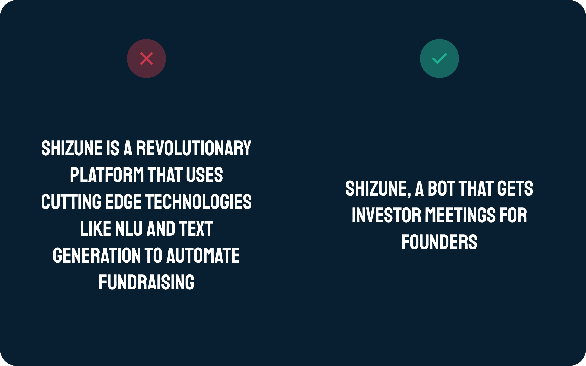 My example is short (less than 60 characters). They're so simple any investor on the planet can understand all words in them. And hopefully, they're intriguing since there are no other bots that can get meetings for founders. The product is not there yet, but it's a part of my big vision.