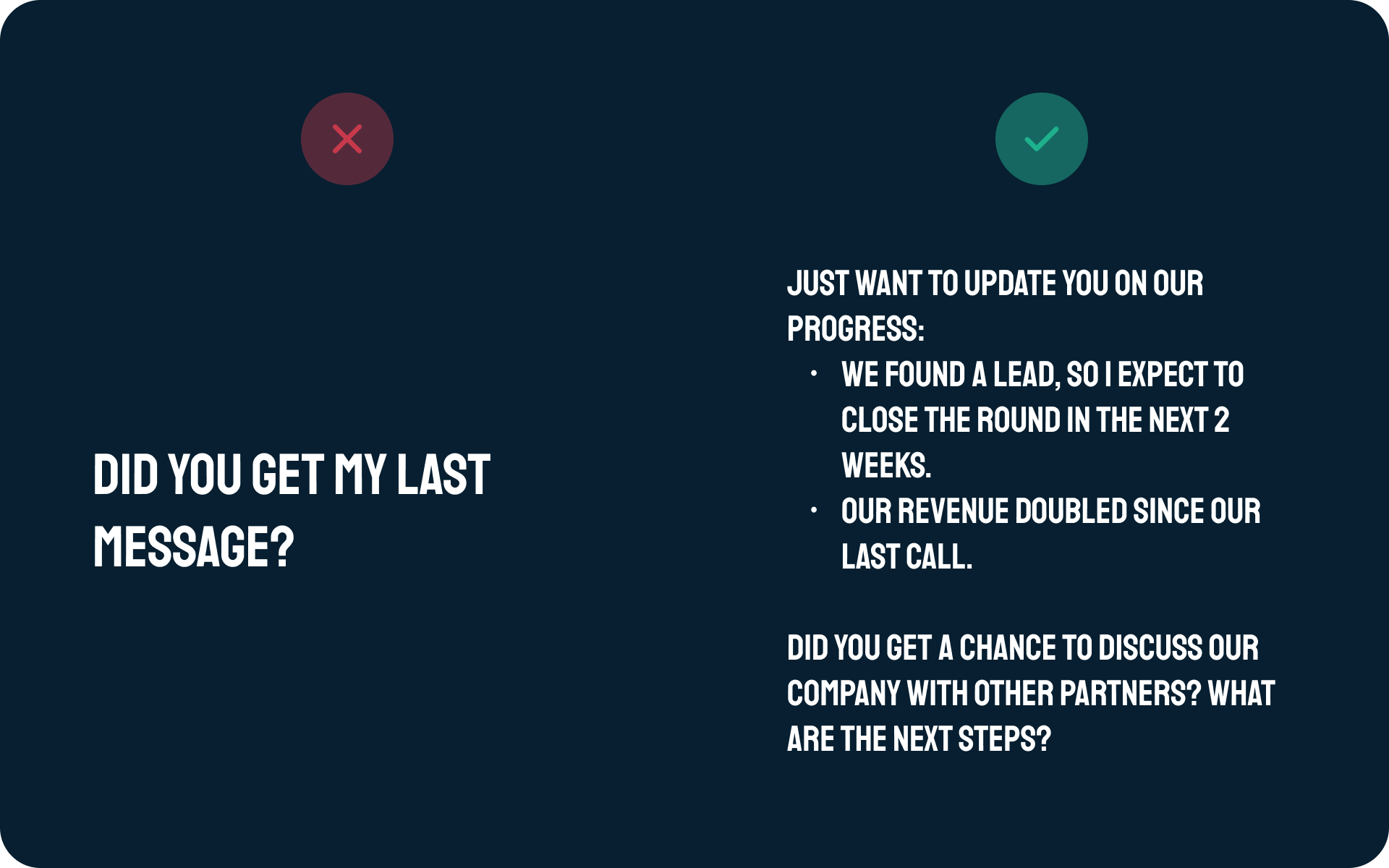 - Create urgency and FOMO. Always share something exciting. The most exciting things for investors are updates about your traction or funding progress.