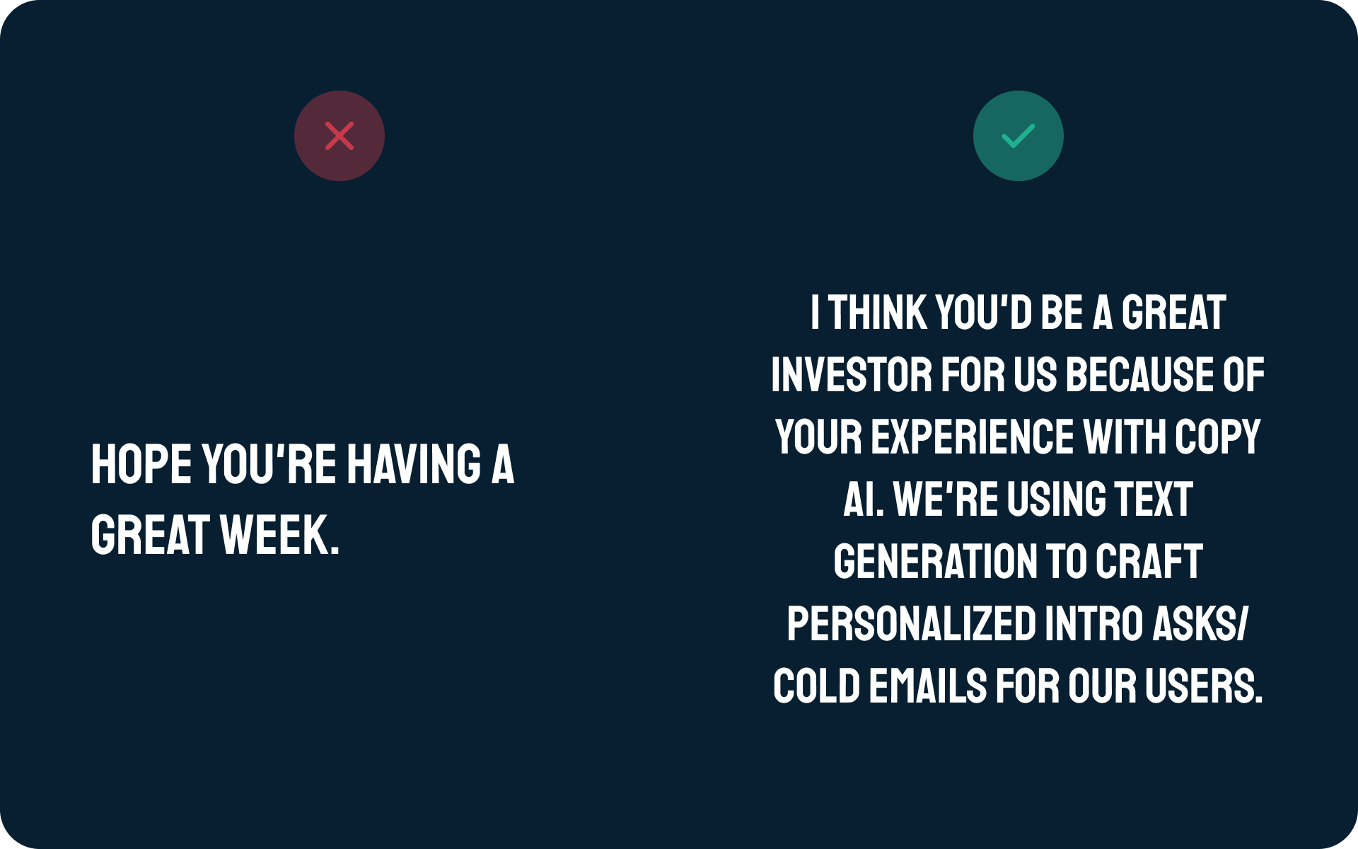 I think you'd be a great investor for us because of your experience with Copy AI. We're using text generation to craft personalized intro asks/cold emails for our users.